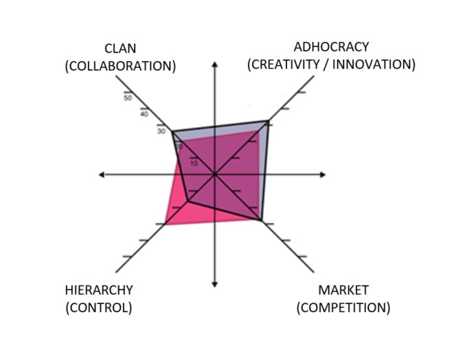 OCAI was used as a central tool to manage the shift towards a culture of service in internal support staff. The power of the FVC here is that it allows “service” to be translated into a particular cultural mix: